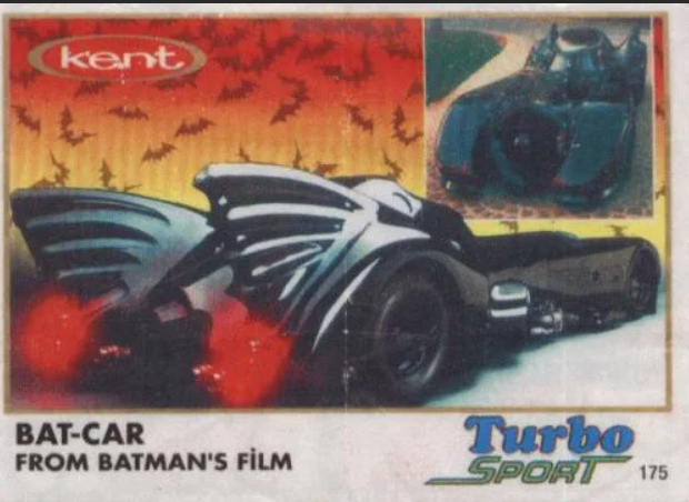 Для многих, кстати, было большой удачей найти вкладыш с бэтмобилем (машиной Бэтмена) в серии "Turbo Sport". Жаль, мне этот вкладыш никогда не попадался.