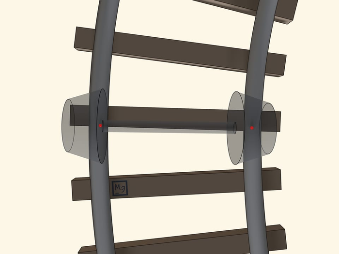 Поэтому поверхность катания делают конической: на плавных поворотах колесные пары по инерции смещаются к внешнему рельсу, и колесо катится по нему той зоной, где его радиус больше.
