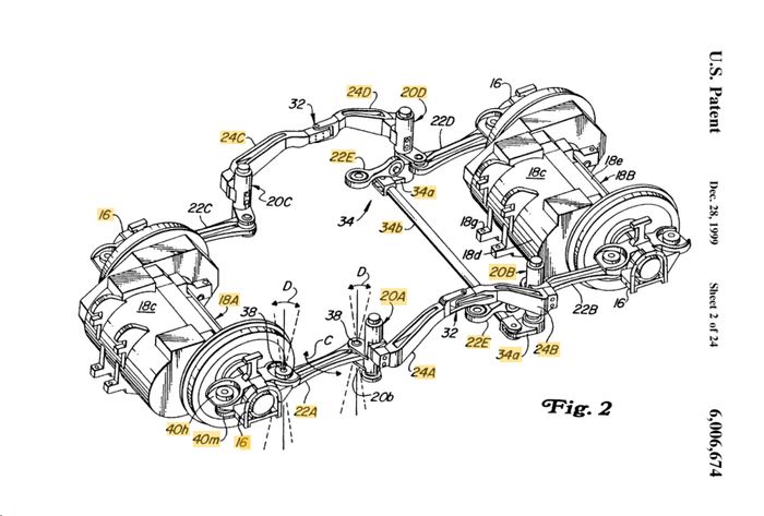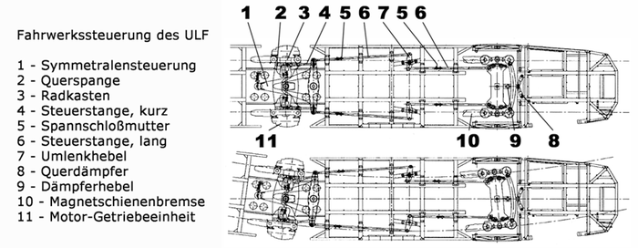 Для передней и хвостовой секции была разработана система, при которой секция помимо тележки в сочленении опиралась на собственную одноосную тележку.