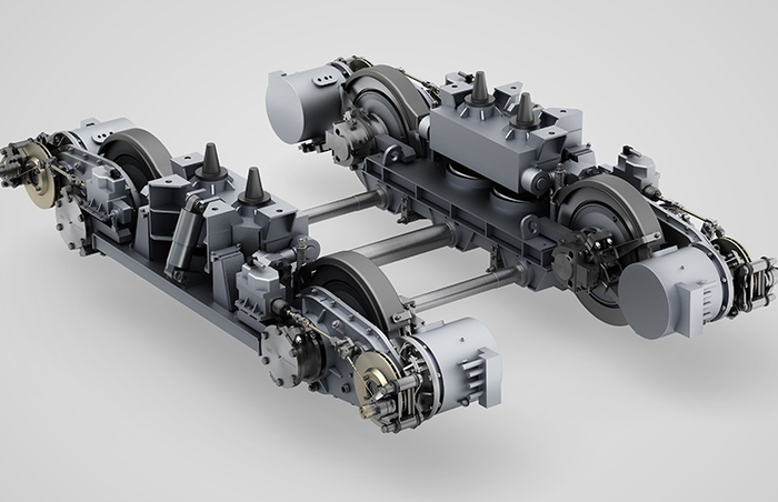 На тележке с обеих наружных сторон размещаются два групповых привода "один двигатель на два колесных центра", каждый со своей стороны.
