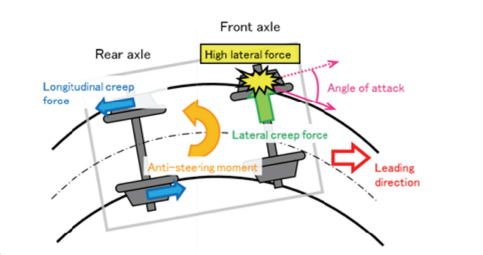 В кривой малого радиуса гребень колеса прижимается к внешнему рельсу, что сопровождается сильным скрежетом и проскальзыванием другого колеса колёсной пары.