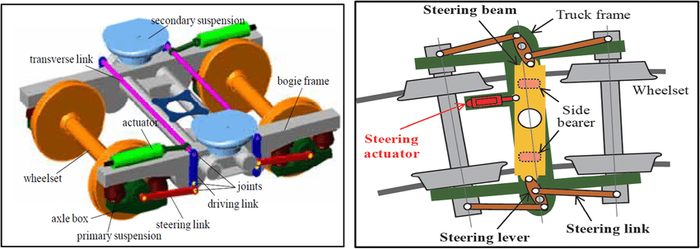 Одним из способов улучшения показателей вписывания железнодорожных экипажей в кривые, снижения угла набегания, работы сил трения, а, следовательно, и сильного износа колёс и рельсов является применение механизмов радиальной установки колесных пар (РУКП).