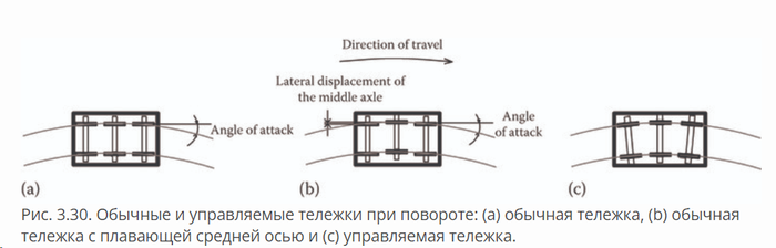 Понятно, что для плавного вписывания колёсных пар тележки при небольших радиусах кривых в повороте нужно, чтобы колёсная пара занимала радиальное положение к центру поворота.