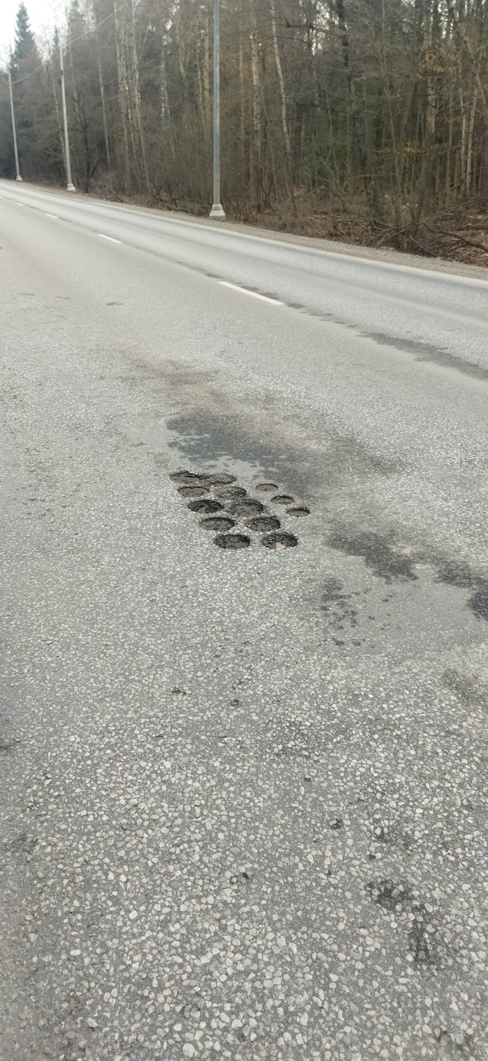 Место действия: Льяловское шоссе под Зеленоградом. Перекладка асфальта выполнена где-то полгода назад. На представленном участке длиной метров 20 выполнено 5 мест (сфоткал 3), где бурили сразу после укладки. Во, что превращается дорога после таких проверок качества видно на фото. На всё протяжении шоссе до Менделеево (это где-то 3 км) с десяток таких мест, где бурили асфальт, а теперь там ямы.