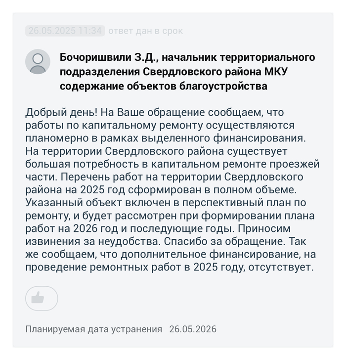 Для ЛЛ - 2023-2025 год получаю отписки от «Бочоришвили З.Д., начальник территориального подразделения Свердловского района МКУ содержание объектов благоустройства» в духе «денег нет на ремонт дороги не по ГОСТ, рассмотрим в следующем году». И так 3 года подряд. Но когда кто-то попадет в ДТП и оторвет колесо, или не дай бог пострадает человек - деньги найдутся через суд.