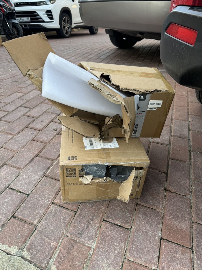 Уже позже, просматривая фотографии, которые были сделаны чисто случайно мы заметили, что коробки продавлены, а коробки нами были запакованы под завязку. Часть вещей нам помогали упаковывать друзья и они видели в каком состоянии были наши вещи. На коробках, которые были упакованы нашим скотчем (темно-серого цвета) сверху проклеен скотч коричневого цвета (а это уже не наша упаковка).