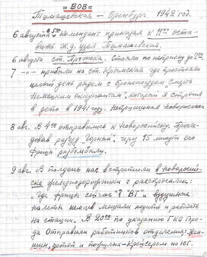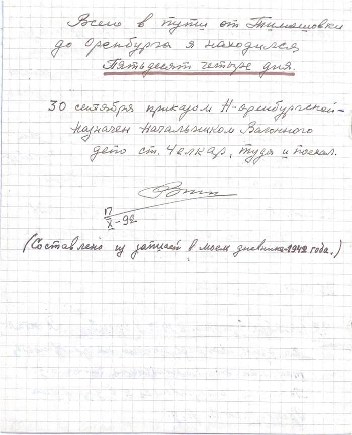 В этот раз делюсь выдержками из его дневника во время эвакуации с железнодорожного узла Тимашевская в сторону Оренбурга. Записи сделаны его рукой.