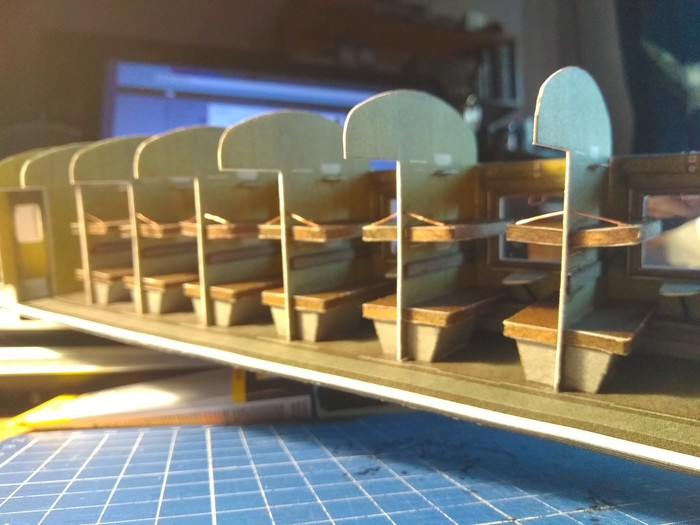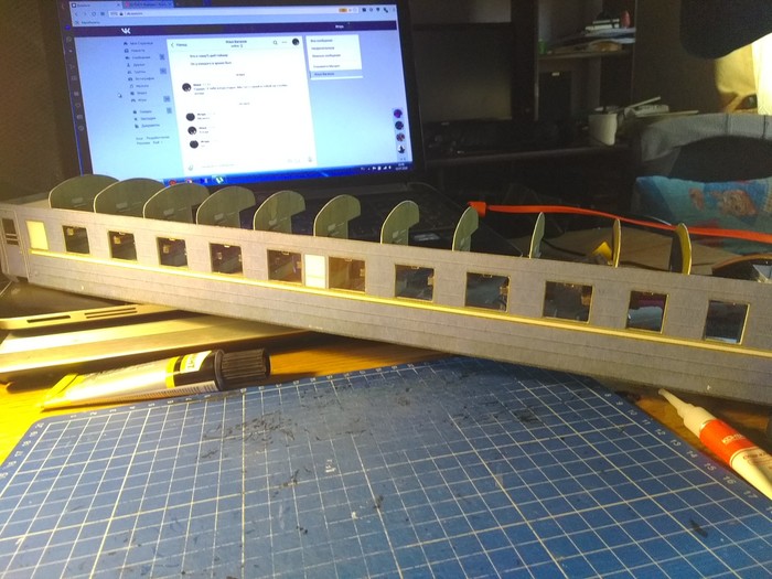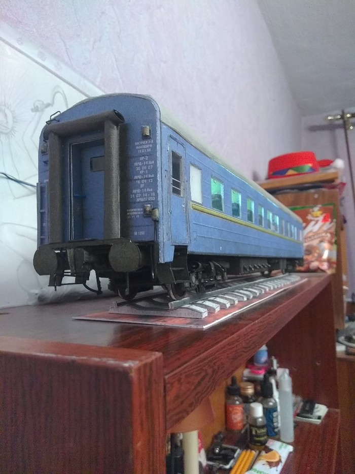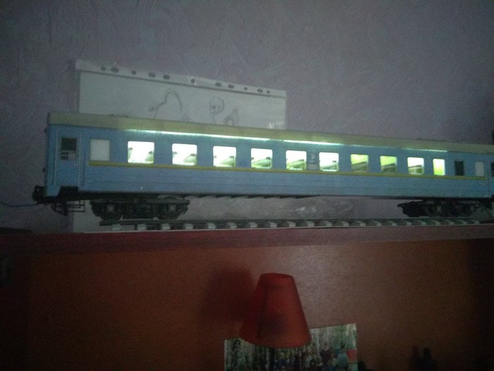 Решил немного заморочиться и провести туда светодиодную ленту, которая питается от батарейки крона = 9v, что бы вагон не просвечивало насквозь в стенках, перегородках, на полу и на крыше сделал прослойку из фольги. Зы: у вагона колёса катаются по рельсам 😯☺😉