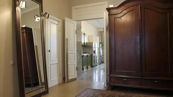 В квартире на 6-м этаже 6 комнат, общая площадь 212 квадратных метров. В ней есть гостиная с каминным залом, три спальни, три санузла (блин, даже у меня всего два, - прим. ТС), два балкона, оборудованный отдельным лифтом черный ход. Также есть возможность выкупить мансарду.