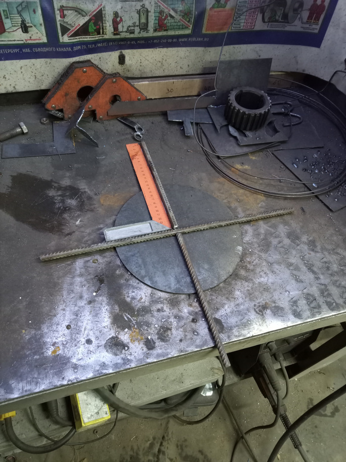 Основание сделано с запасом, чтобы уже по месту можно было определиться как будет крепиться к станку. Остатки демонтированного 5-ти тонного бака, отрезаю кусочки, потому форма не особо кошерная :)