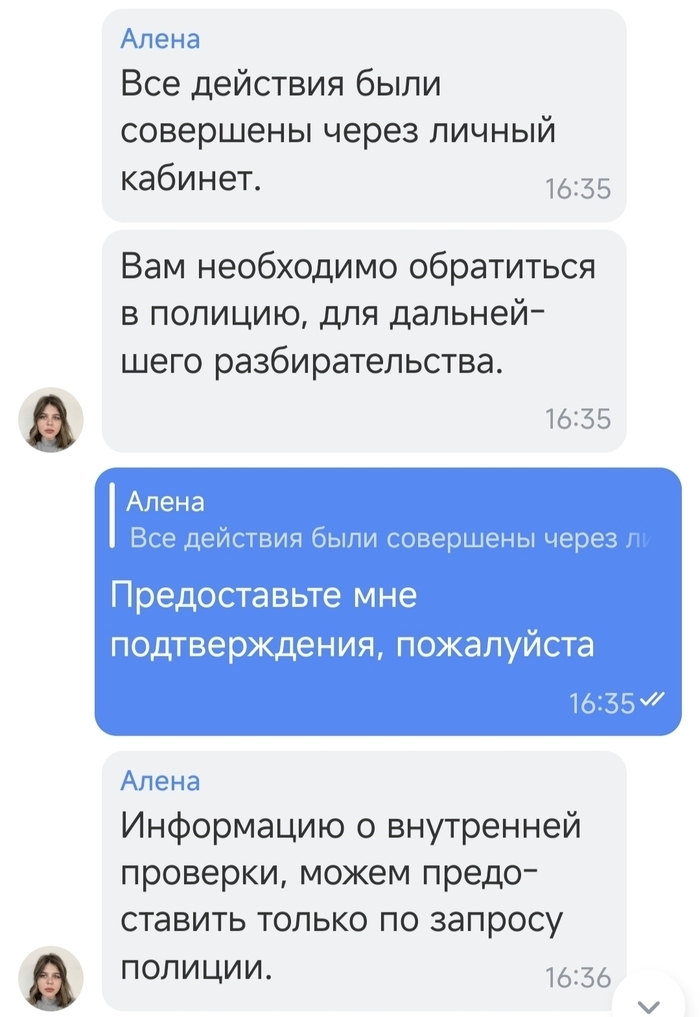 Всего-то через н-часов, в течение которых меня связали, наверное, со всеми отделами, где вообще был телефон, мне промямлили, что-то про то, что деньги сняли на основании моего письменного заявления в чате, которое внезапно оказалось очень вовремя "удалено из системы". А ой, да? И, конечно же, восстановить его невозможно (ага, рассказывайте, что логов у вас нет и инфу восстановить нельзя)