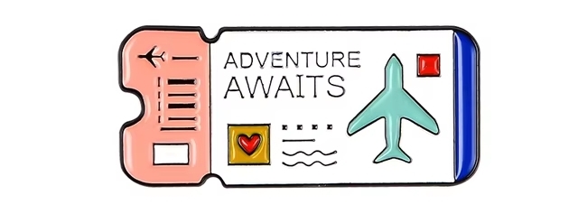 Эмалированная булавка в виде билета на самолёт 'Приключения ждут'. Стоит 92 руб. ссылка на неё