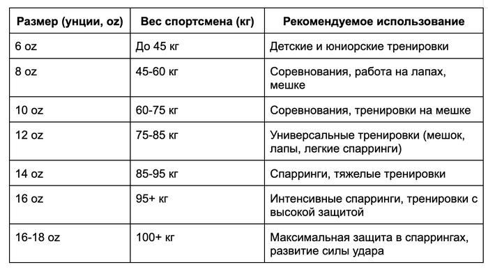 Перчатки бывают разных размеров и веса, что обозначается в унциях (oz). Чем больше вес перчаток, тем лучше они защищают руки, но при этом уменьшают скорость ударов. Основные категории веса: