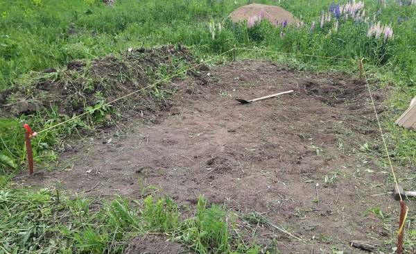 Вчера в обед успела за пару часов снять верхнюю часть грунта (15-30 см) с травой в размеченном под бытовку месте 3*6 м. Придётся снимать ещё (т.к. везде указывают, что нужно весь плодородный слой срезать) и выравнивать. Но, вот в правом дальнем углу под 30 см земли оказались какие-то куски пенопласта, превратившиеся в труху куски пней и ещё какой-то мусор! Оо! Кажется глубже капать нет смысла, буду засыпать супесью, чтобы выровнять получившееся углубление.