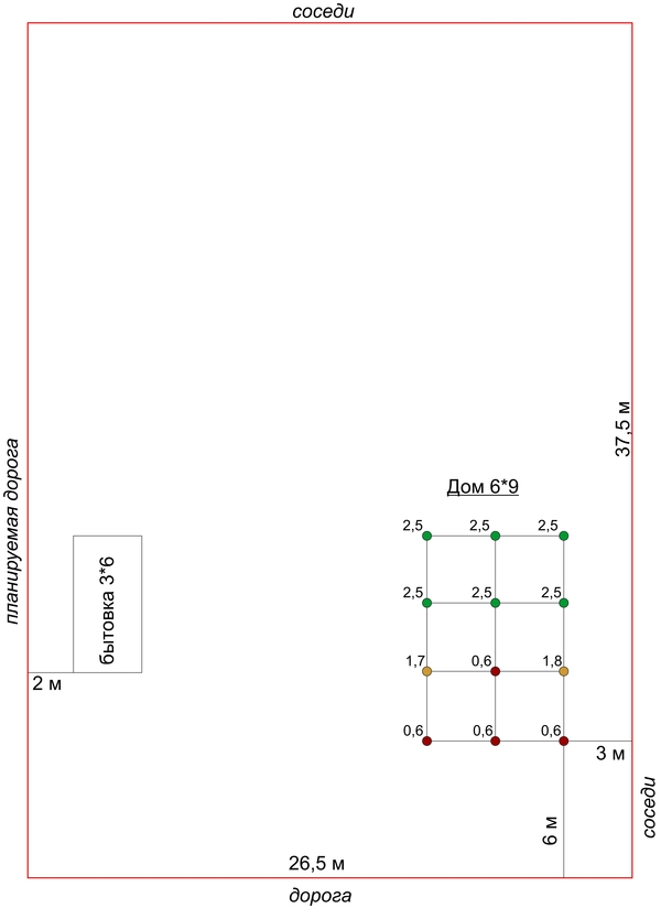 Параллельно выяснилась серьёзная проблема. Ямобур не смог пробурить больше 60 см в нескольких, отмеченных под сваи фундамента дома, местах, потому что упирается в какие-то деревяшки, брёвна или хз что ещё. В одной яме (2,5 м) видно, что на глубине около метра начинается горизонт какой-то трухи. В общем. Есть конечно вариант сдвигать дом вглубь участка ещё на 6 м (т.к. не бурятся ближние к дороге, см. рис.). Разворачивать не вариант, потому что роза ветров примерно в сторону дороги. Слева (вместо бытовки) нельзя - близко магистральный водопроовод. Есть вариант попробовать прокопать экскаватором..