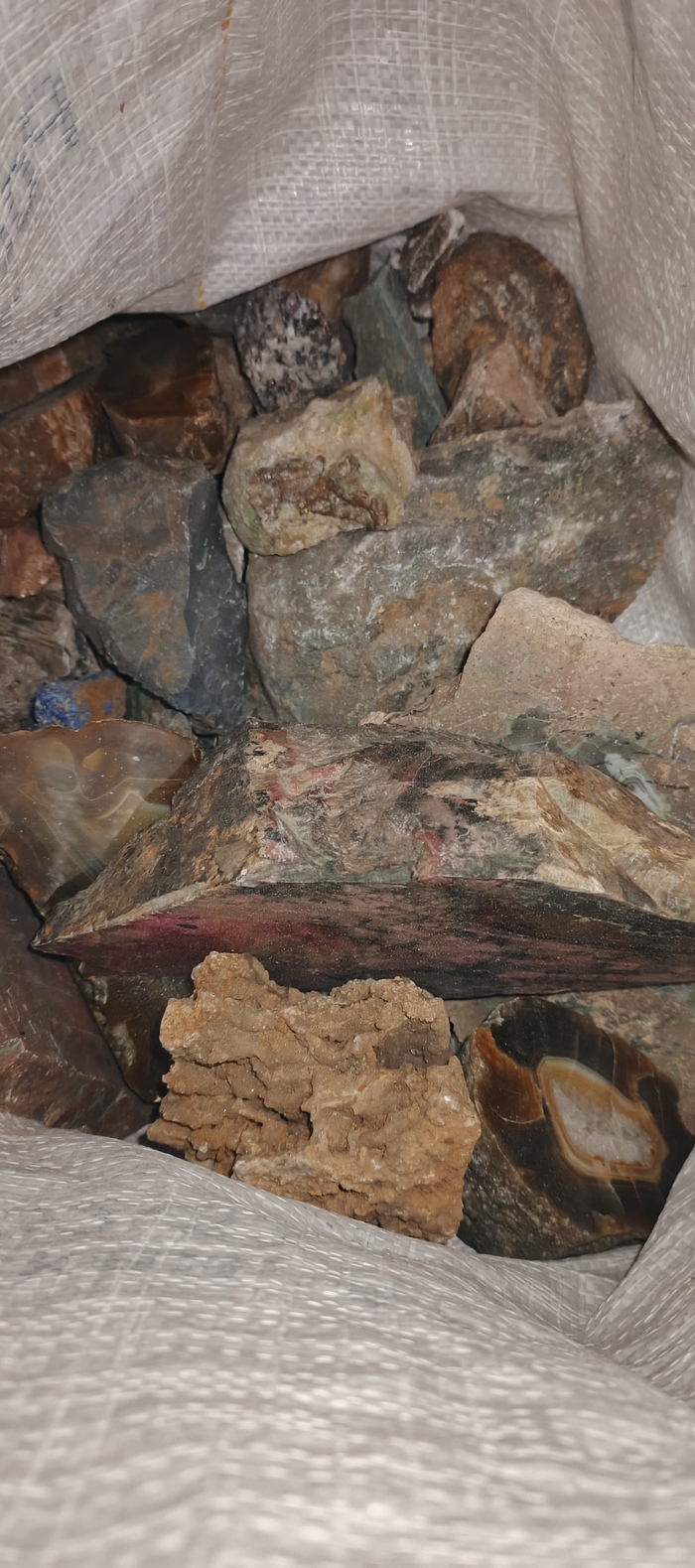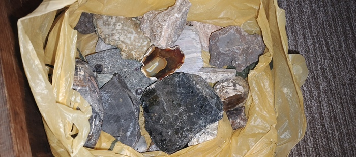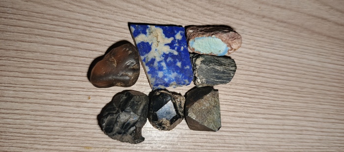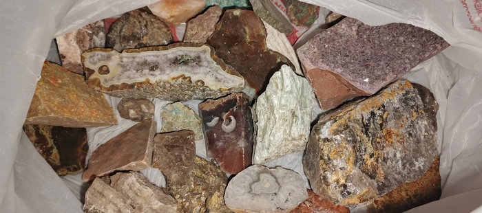 Цена низкая. Можете оставить красивые камни себе или, отдать бесплатно в школьный кружок юнных минерологов, если такие остались ( в нашей школе, например, уничтожили не только библиотеку, где хранились книги до 2010 года, но и зимний сад, выбросив 100ни растений зимой на снег) . В первом кульке: верх- лево, родонит (розовый); нижний вишнёвый и похожий на него справо-вертикальный, содержат ртуть; тёмный кристалл может быть кварцем, морионом...; зелёный слева имеет много похожестей, больше напоминает азурит не7кристаллический ... коричневый по-центру - жеода халцедона из Голутвина; сверху-справа щётка кварца. 2: коричневый - агат; 3: синий- лазурит, под ним - агат, под ним розоватая яшма и внизу коричневый агат; 4: -; 5: справа вверху слабая аметистовая щётка ниже концентрические- агат(1-2); 6: зеленоватый змеевик, подним- друза кальцита; 7:синий лазурит, под ним чёрный- кристалл граната ( альмандин, точно не помню?) Оставьте, что нравится, например, впечатайте над дверью...