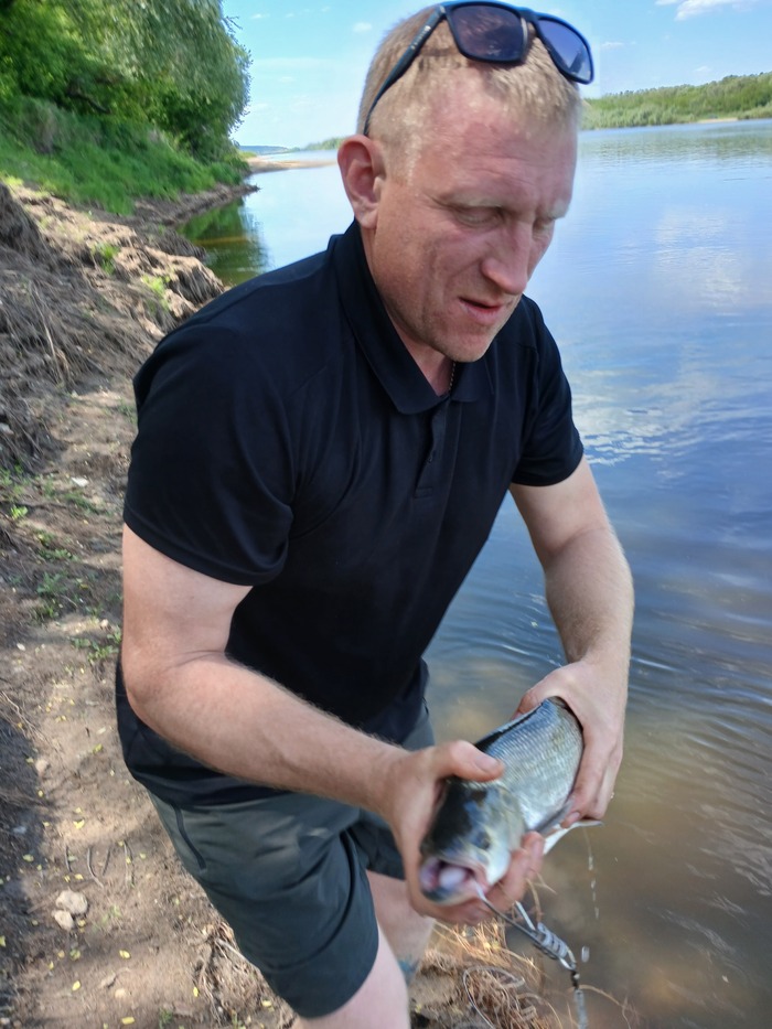 Потом стукнул окунь грамм на 300,я его вытащил ,зрители попрощались и ушли и я вздохнул с облегчением.Далее был ещё один жерех грамм на 700 и второй под двушку. И тут пришел новый товарищ с собакой огромной и глядит на меня улыбается. Я типа спрашиваю ,ну что кончилась моя рыбалка,сейчас пёс купаться будет. Нет говорит ,пёс культурный ,зайдет в воду на пару метров и сразу выйдет..И говорит мне ,мол,третий день наблюдает как рыба тут кипит. Но я так вяло отвечаю,что это жерех и его хуй поймаешь ,мол,утопия.