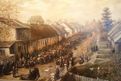 А следующее произведение еще более необычно. Художник нарисовал жизнь провинциального города Вилейка, опираясь на фотографии сделанные Берки Берманом в начале ХХ века. Кстати, именно его мы и видим на представленном фрагменте — он словно приветствует именно нас!