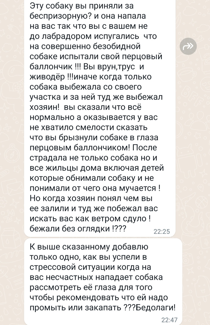 Через 5 минут - звонок. Мужчина, начинает общение вежливо, и я, тоже вежливо, поясняю за ситуацию. Собеседника хватает минуты на полторы, потом флер вежливости спадает, и начинается стандартное "ты че, не мужик, пойдём выйдем нормально побазарим", "я тя запомнил", и вот это всё. В промежутках между матами узнаю, что я обязан был сообщить ему, что я залил собаку перцем (по какому НПА - не ответил),что у него вся семья страдает от перца после того, как пообнимали собаку (верю, неприятно, но шоподелать), и вообще это собака сделала подкоп и сбежала, пока он был на работе (не знаю, почему это должно меня волновать). Сообщаю ему, что никуда не пойду, и что разговор записывается, мужчина бросает трубку. Потом перезванивает - говорит, что у него стоят камеры, и он всё посмотрел, у него есть запись, и ему меня очень жаль (вспомнил, или придумал). Говорю, мол, отлично, несите записи в полицию. на этом всё утихло.