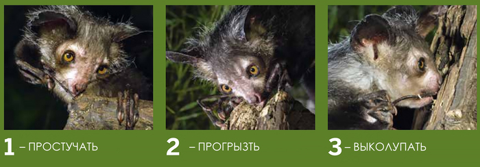 Обнаружив пустоты, руконожка прогрызает в коре отверстие и снова пускает в ход свой волшебный третий палец. Просунув его в отверстие, она, словно крючком, вытаскивает аппетитную личинку. Ням!