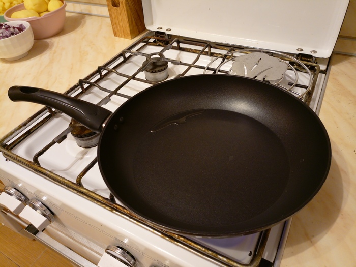 Ставим сковороду греться, наливаем немного подсолнечного масла. Вообще, масло нам потом ещё понадобится. Тут как с солью, несмотря на то, что, казалось бы, бекон сам по себе жирный, на большой объём картохи этого количества жира недостаточно и можно добавить масла для обжарки, иначе может быть суховато. Но, опять же, смотря сколько вы бахните бекона. Сковорода, вроде, 28 см., бекона ушло примерно 250-300 грамм, а картохи на глаз, но на полную сковороду. Впрочем, тут всего на глаз: