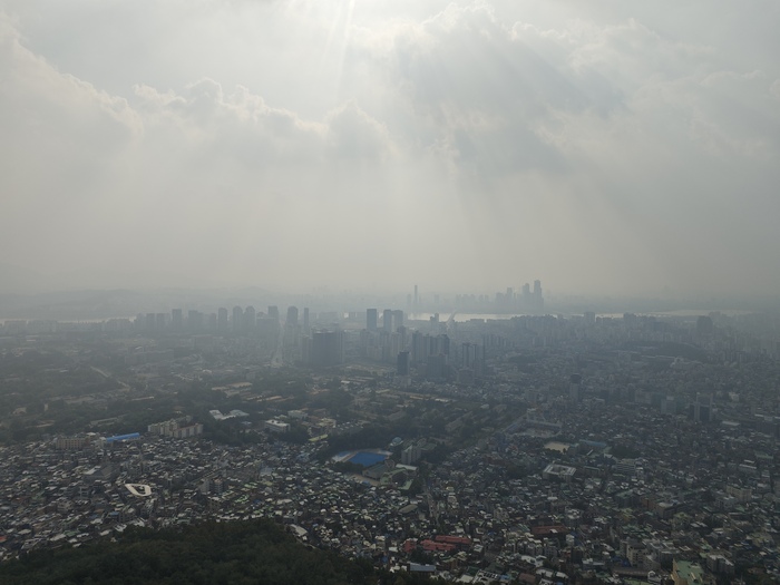 На гору ходит фуникулёр, но мы лёгких путей не ищем. Подъем пешком занимает не больше часа неспешным шагом и проходит по пологой дороге. Покупаем билет на смотровую, ждём минут 15 и поднимаемся. Сеул в дымке, но районы и ближайшие горы узнаваемы. Вау эффекта нет. Покупаем сувенирчиков и спускаемся по южной тропе.