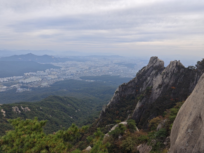 Видимо на меня кот чихнул и заразил меня своей страстью забраться куда-нибудь повыше. В этом году у меня было три поездки в горы, но узнав по Пукхансан я сразу поняла, что мне туда надо! Парк находится в черте города, добраться туда не сложно. Но я начала подъем только в час. В принципе, времени было достаточно. Я для себя прикинула, что спускаться нужно начать в 16 часа, так как в 17-30 начинается закат и в 18 уже полностью темно. Буквально через километр после старта была развилка с указателями. Налево сложная трасса около трёх километров, направо - лёгкая, около 4х. Я выбрала сложную. Не спрашивайте. Сама не знаю почему. Для себя по дороге я сделала вывод, что я совершенно не в форме. К 15 часам я думала, что сдохну, но потом пообедала и вроде жизнь наладилась. Последний кусок трассы очень красивый, а на верху вообще невероятная красота и вид на город!