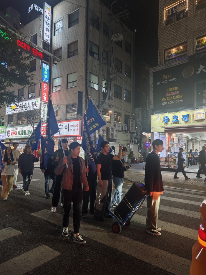 Шоппинг в районе Мёндон. Косметика, сувениры, еда, косметика - рюкзак все тяжелее. Проводим ревизию купленного и мой лейтенант несёт часть покупок обратно, потому что в самолет такое нельзя. Распихиваем покупки в чемодан и рюкзак, не влезают. Избавляемся от части упаковки косметики и игрушек. Теперь пазл сложился. Время ещё не позднее, в районе не все заведения забиты. Ужинаем в Митко суши и идём гулять по району. К этому времени столики на тротуарах почти заполнились корейцы начинают вечерний гудеж. На основной улице сидит в основном молодежь тут весело и шумно, смех, разговоры и свет. Мы сворачиваем в небольшой переулок там в полутьме сидит другой контингент - люди старшего возраста. Они бухают совсем не весело. Большая часть что называется "в хламину" - шатаются стоя у стеночки, шатаются сидя на стульях, ни смеха, ни разговоров, в основном сосредоточенно пытаются не упасть со стула или взять палочками еду. Страх и ужасть в общем. Выбираемся обратно на основную дорогу. Там марширует группа молодежи с флагами, дуделкой и колонкой на тележке.