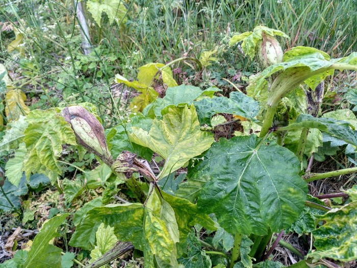 Однако время шло, росла обычная трава, но и желтовато-ржавые лопухи продолжали выситься над ней и доминировать. Зашёл недавно в эту рощицу снова, посмотрел внимательно. Лишь несколько ростков зачахли в том размере, в котором я их опрыскал. Все остальное продолжает расти! Жухлое и вялое, но формируются уже толстые стебли и завязи цветков-зонтиков. Опрыскал неделю назад всё ещё раз, ушло втрое больше жидкости, так как площадь листьев уже сильно выросла. Жду. Пока только дополнительное пожелтение. Так что я делаю не так? Раундап из Максидома.