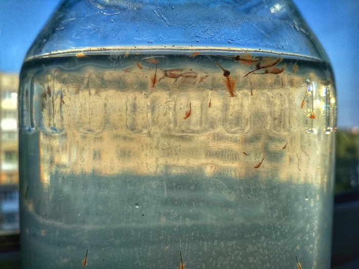 Примерно месяц назад привезли родителям воды с солёного озера (для суставов полезно вроде). Хотя водой это назвать уже сложно, ибо концентрация соли зашкаливает. Единственные твари, которые могут жить в этом рассоле - микроскопические рачки Артемии. Когда набирал воду, в банку попало штук 5 таких.