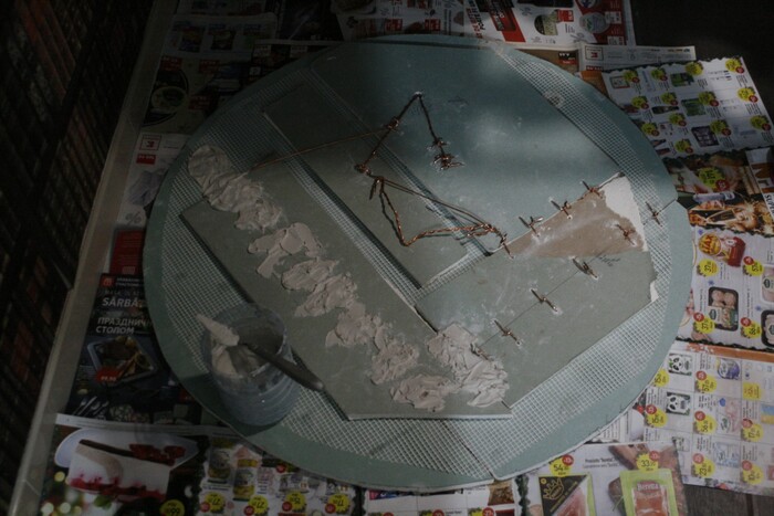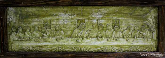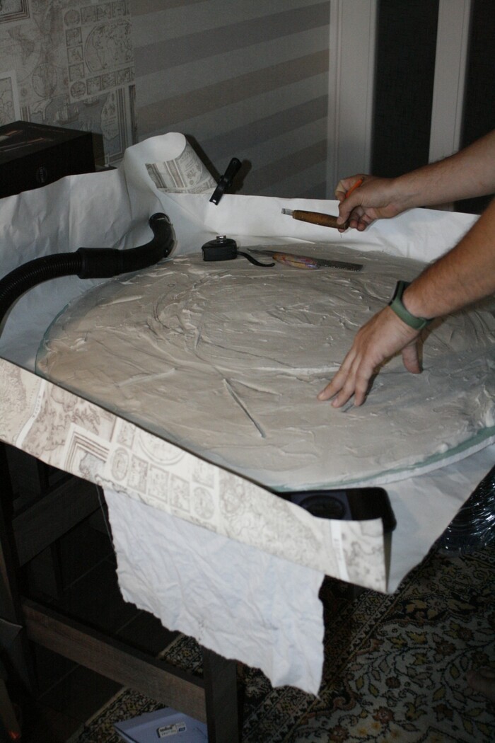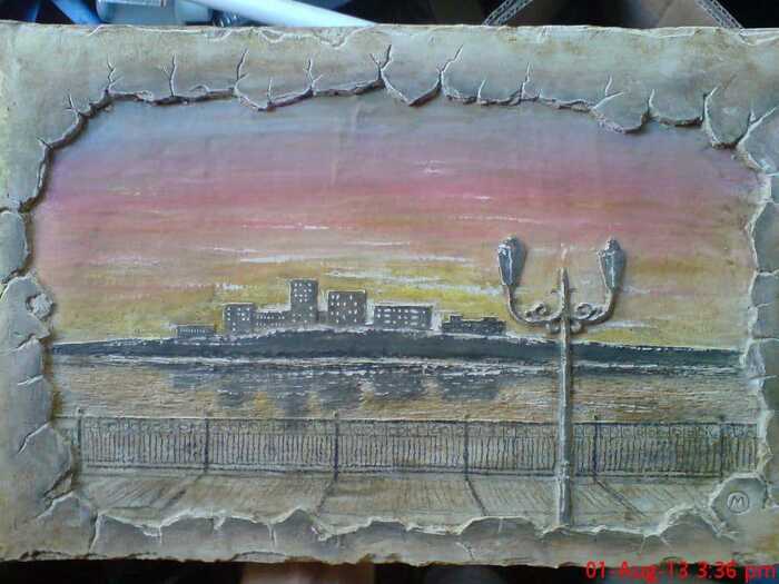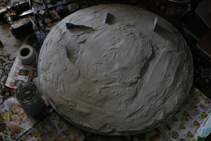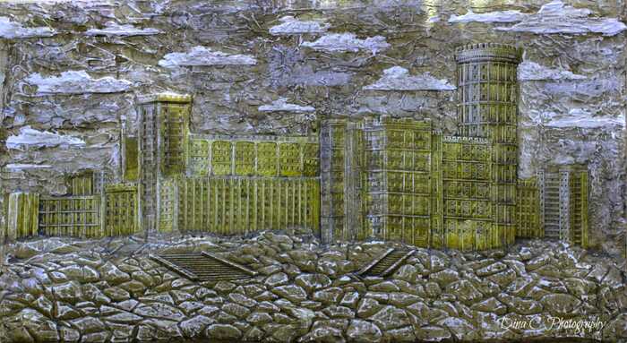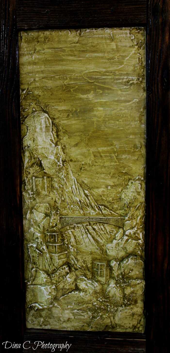 Золотые камушки, разбросанные по поверхности панно, словно светятся внутренним светом, придают ей загадочность и глубину.