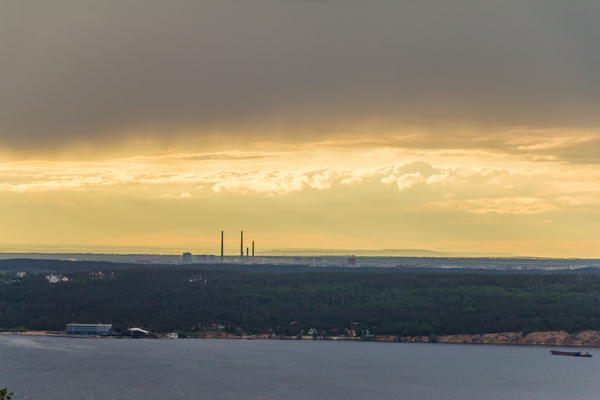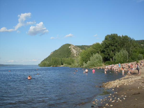 Жигулевский пляж, на заднем фоне Тольятти. Вода грязная и холодная, но людей это не смущает, а вот песок мелкий и золотистый
