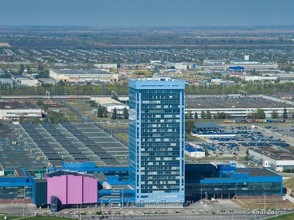 Градообразующее предприятие - завод "Автоваз". И этим все сказано. Завод занимает территорию 600 гектаров, площадь зданий предприятия - более 4 млн кв.м., с его строительством начался резкий прирост населения, так что история Тольятти это в основном история Автоваза. На территории завода есть 24 кпп. Только представьте себе... 24 пропускных пункта! Цеха сборки, сварки, покраски, разработки, стоянки и бог знает, чего еще. И на фоне всего этого великолепия возвышается здание заводоуправления