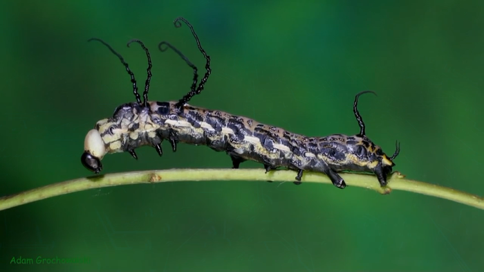 Гусеницы первых трех возрастах своего развития несут на первых двух члениках тела по паре очень длинных волосков, на 10 сегменте имеется еще один очень длинный волосок. На четвертом и пятом возрасте, в результате линьки, волоски утрачиваются. Гусеницы становятся очень яркими.