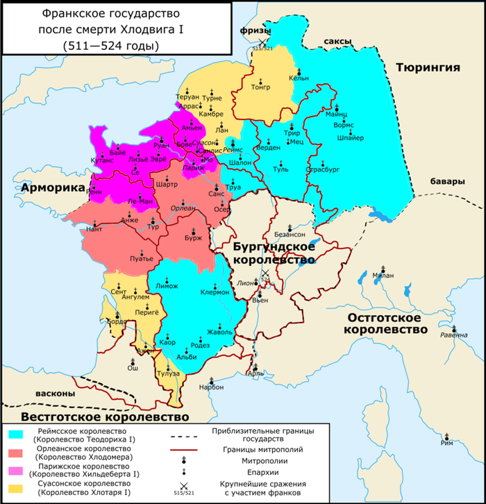 В итоге Сигизмунд, несмотря на поддержку своего брата, Годомара II (524-534), был взят в плен и казнён вместе со второй женой и сыновьями от неё. Однако война на этом не закончилось, т.к. Годомар успел сбежать и продолжил оказывать сопротивление. Умерили свой пыл и отступили франки только после поражения в битве при Везеронсе летом 524-го. Отчасти это, похоже, было связано с тем, что им тогда резко нашлось чем заняться и на родной земле – ведь в той битве пал второй сын Хлодвига от Клотильды – Хлодомер (511-524), которому достались земли со столицей в Орлеане. И из наследников у него, помимо братьев, были три малолетних сына…