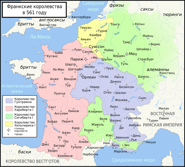 Короче, что я хотела сказать – от осинки не родятся апельсинки. Времена были суровые, а воспитание непоследовательным, так что принцам приходилось брать с папы пример, что они во многом и сделали. И начали с того, что вскоре после его смерти в 561-м году устроили междуусобицу, которую решили прекратить, пока всех не поубивали, лишь под давлением церкви и распределив земли по жребию. Старшему, Хариберту, достались земли на западе и юге с центром в Париже, что и поспособствовало тому, что свою дочь от первой жены, Берту, он позже отдал замуж за короля Этельберта Кентского (об этом было тут: История нашего мира в художественной литературе 2. Часть 11. «Рассветный ветер»). Гунтрамну достались не намного менее обширные и богатые земли в центре и на юго-востоке, у итальянских границ, со столицей в Орлеане. Владения Сигиберта, Австразия со столицей в Меце, разделены были на две части и лежали как на северо-востоке, так и на юге, но в целом тоже были немалыми. А вот Хильперика братья поначалу нагло обделили, дав ему в качестве столицы хоть и Суассон, но с очень малыми территориями в придачу.