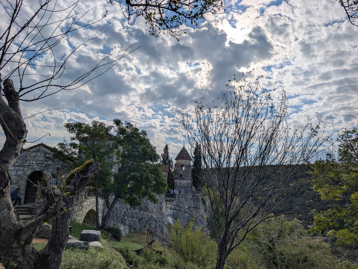 По утру набрали воды в роднике и пошли в православную церковь Мотсамета. Церковь стоит на живописном ущелье, и хоровое пение красиво дополняет ропот горной реки.