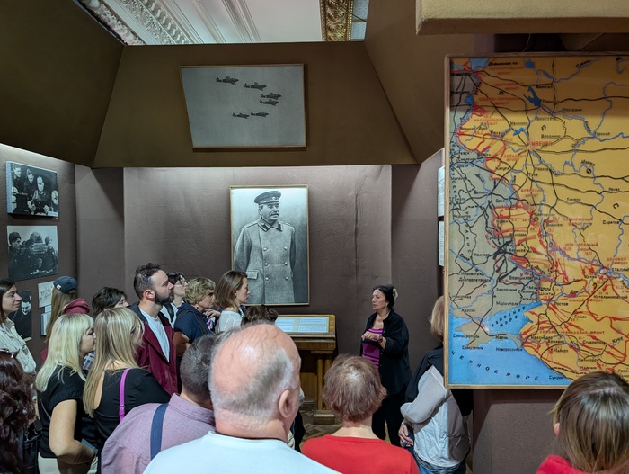 У английских гидов текст экскурсии был примерно такой: Сталина все боялись, и все жили в страхе. Потом Сталин умер, но страх в сердцах всё ещё жив. А вот на этой фотке тиран, Рузвельт и Черчилль зачем-то собрались в Ялте поесть хинкали.