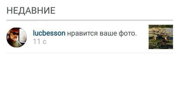 Об этом я рассказывал, наверное, уже всем знакомым, некоторым — даже по 5 раз (ещё и детям, и внукам буду рассказывать). А тем, кто пока не слышал, вот, значит, как было: тот самый Бессон как-то лайкнул наше с товарищем фото с озера «Копытце» в Усть-Лабинске (на секундочку!). И в этом же году написал сценарий про пехотинцев, поднимающих фашистский клад со дна боснийского озера (совпадение? Не думаю). А лайк потом вероломно снял, хорошо, заскринить успел.