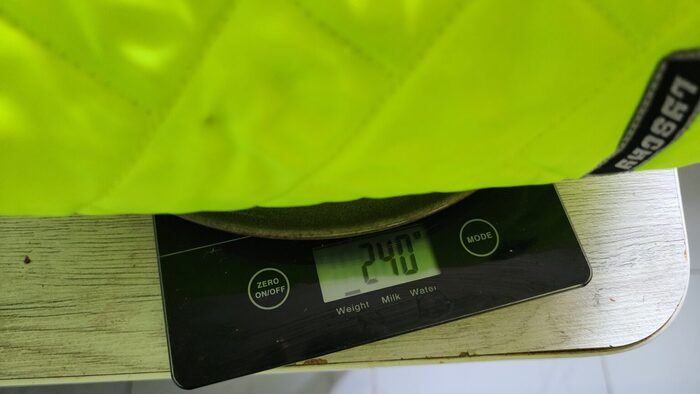 А вот вес жилета с водой. Простые математические вычисления показывают, что жилет набрал почти 1,5 литра воды! Так что это ответ на ещё один вопрос “а чё это как облиться водой”? Нет, не так. Это как облиться 1,5 литрами воды где ничего не стекло мимо, испаряется постепенно а ты внутри при этом почти сухой =)