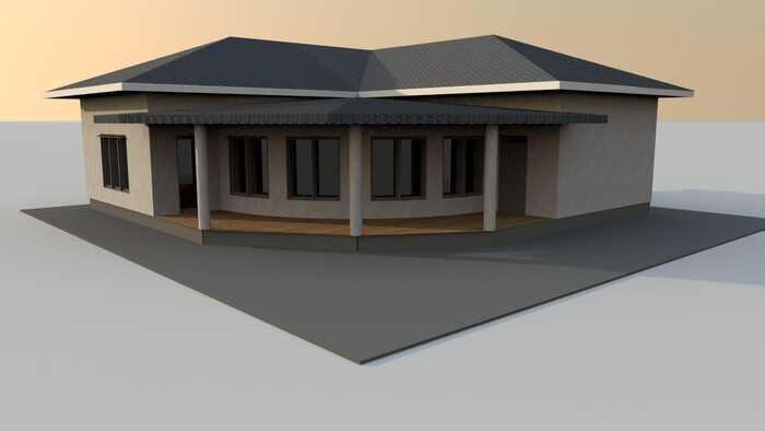 Большая (огромная) центральная часть - гостиная кухня. Камин пианино и панорама со всех окон. (Причина выше) Крытая веранда. Пандус во двор. Ах да самое главное ещё в пожеланиях округлая (полукругая) фасадная стена. Не эркер. Вот картинка что пока смогли родить. Буду признателен не только за критику но желательны предложения. Вплоть до веранды и второго этажа. Средства для стройки после продажи квартиры думаю позволят осуществить мечту