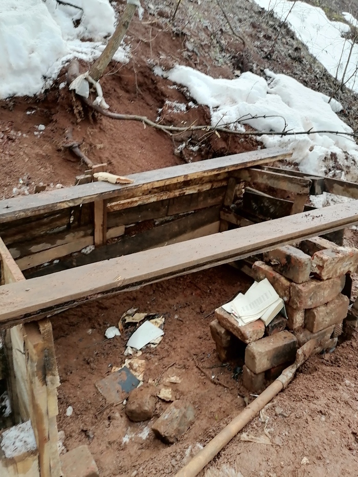 Второй день я строю свою мини-землянку и решил поделиться этим с пользователями Пикабу. Возможно, кому-то будет интересно. Фотографий с момента котлована у меня нет. В общем, выкопав котлован, я положил туда два поддона, скрепил их досками, и каркас уже готов. После этого я сделал заднюю стенку и выложил печку. Фотографии ниже.