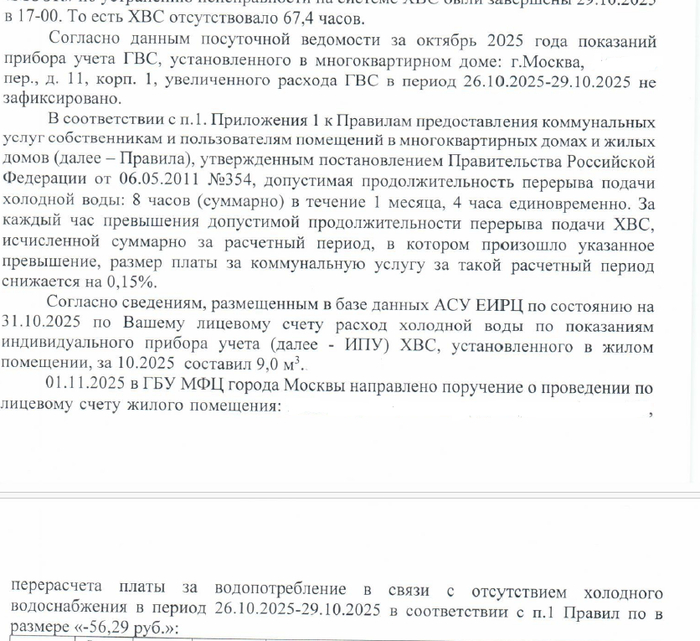 Согласно Постановление Правительства РФ от 06.05.2011 N 354 (ред. от 07.03.2025) "О предоставлении коммунальных услуг собственникам и пользователям помещений в многоквартирных домах и жилых домов" (вместе с "Правилами предоставления коммунальных услуг собственникам и пользователям помещений в многоквартирных домах и жилых домов"), V. Права и обязанности потребителя, п. 33 – д. Я имею право требовать в случаях и порядке, которые установлены настоящими Правилами, изменения размера платы за коммунальные услуги при предоставлении коммунальных услуг ненадлежащего качества и (или) с перерывами, превышающими установленную продолжительность, а также за период временного отсутствия потребителя в занимаемом жилом помещении. Согласно выше сказанному, прошу произвести перерасчет за ГВС в ЕПД за октябрь 2025 г. в связи с тем, что из-за отсутствия ХВС со стороны ПАО «МОЭК» по адресу (адрес) в период 26.10.2025 г. 21:36 по 29.10.2025 г. 17:00 было потребление только ГВС в количествах превышающей норму потребления ГВС в остальные месяцы.