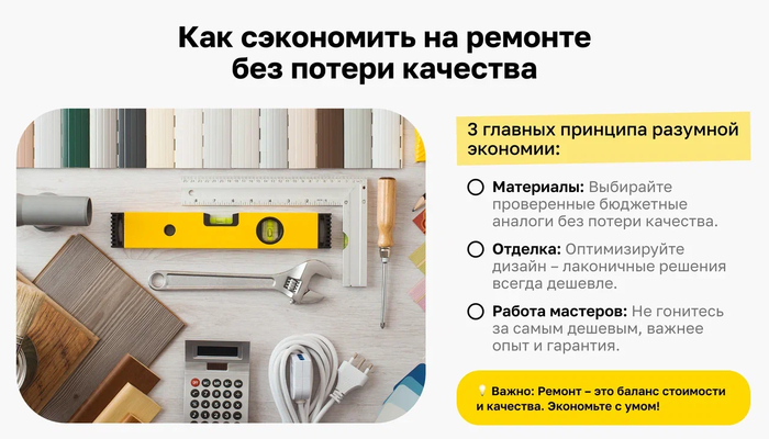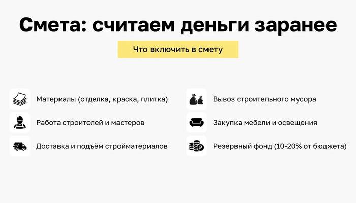 Для расчёта бюджета полезна модель распределения затрат (ориентиры 2025): 50% — черновые работы и инженерия, 30% — чистовая отделка, 20% — мебель и техника. И резерв ≈10% на непредвиденные расходы. Под «черновыми работами и инженерией» обычно понимают прокладку электрики, монтаж сантехники и стяжку пола. А под «чистовой отделкой» — финишные покрытия, покраску и установку сантехники. Мебель и техника формируют итоговую цену за м² ремонт. Эти ориентиры помогают правильно планировать бюджет ремонта и оценивать цены на ремонт в Москве 2025. Для предварительной оценки бюджета на ремонтные реботы полезно использовать онлайн-калькулятор.