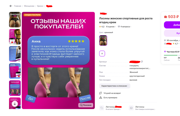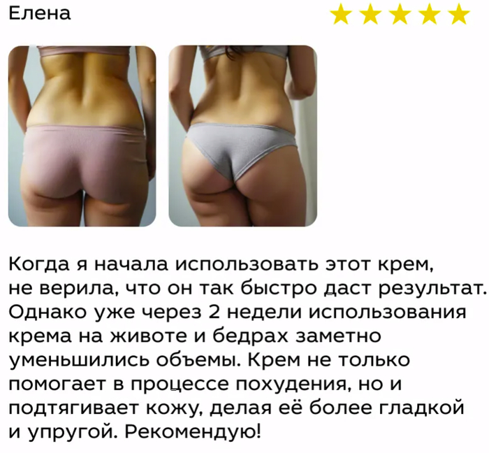 Ловко они придумали! Заходит тётя на маркетплейс за кроссовками, чтоб наконец в зале или на пробежке свой жир растрясти, а тут хоба и крем! 588 рублей 14 ( ЧЕТЫРНАДЦАТЬ КАРЛ!) дней и жопа как орех! И напрягаться не надо, в зале или на дорожке потеть, ешь тётя дальше свои пончики сколько хочешь и натирайся кремом!
