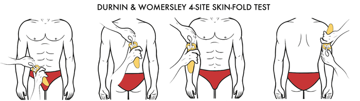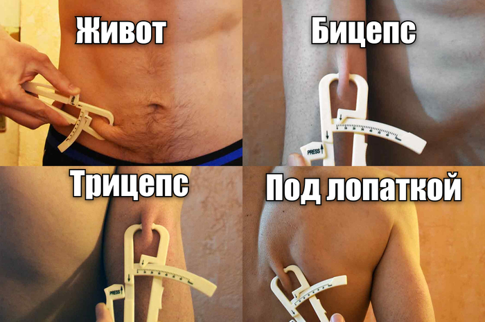 Хватаете себя за кожу, сжимаете, оттягиваете и измеряете толщину складки в четырех местах по всему телу. Потом складываете все измерения и ищите свои результаты в табличке. В каких местах себя хватать?