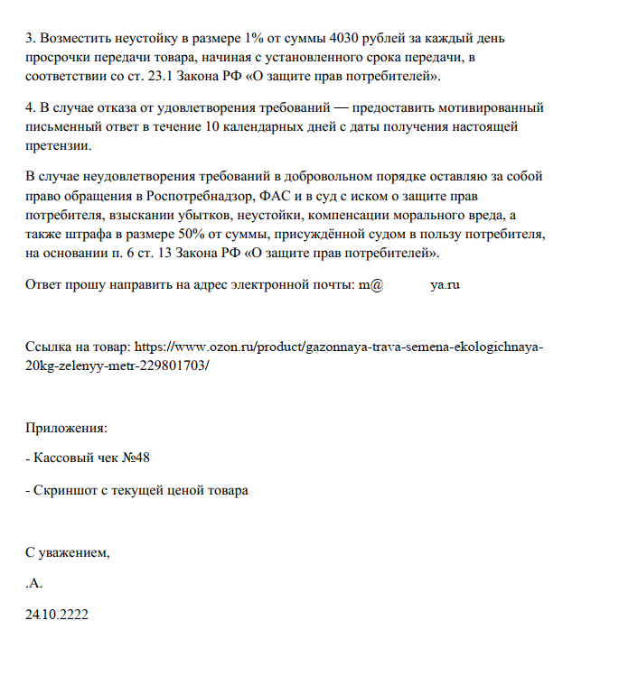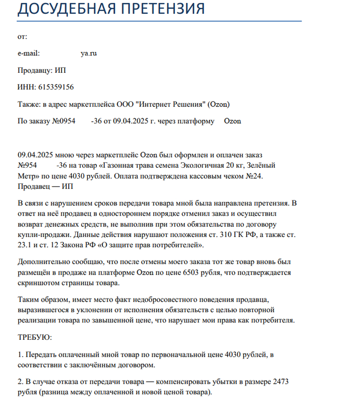 Подержите моё пиво.Весной нужно было газон подновить , заказали травы(семена), а продавец все переносит и переносит доставку, я упорно жду, в итоге спустя какое то время заказ отменяется, а продавец заводит новую карточку с уже завышенной ценой товара .Ай яяй как не хорошо! Пишем досудебку и отправляем в чат Озона и вуаля через пару часов разница у вас на счёте.Пользуемся на здоровье.