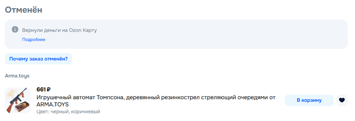 Ребёнок насобирал карманных денег и попросил игрушку с ОЗОНа. Сам выбрал, оплатили, недельку она ехала и ... заказ отменён.