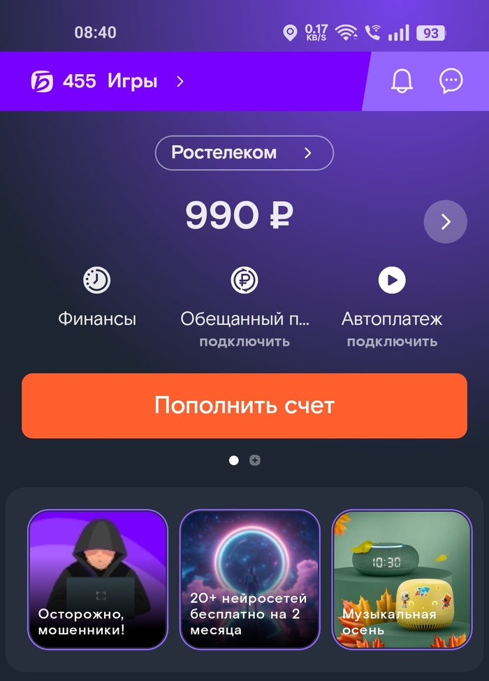 Положил значит 15 числа косарь на л/с Ростелекома за интернет. Пришло уведомление о поступлении, что зачислена тыща, и дальше сижу не парюсь.