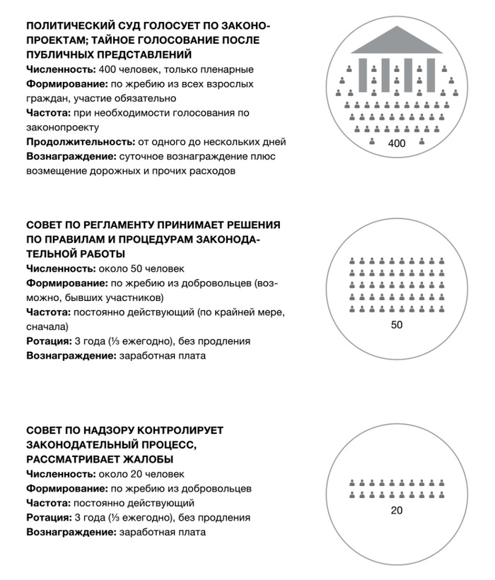 Все эти проекты предполагают, что возможная некомпетентность случайно выбранных представителей будет компенсирована приглашенными экспертами, которые в нынешней системе тоже консультируют правительство. Исследователи согласны, что кандидаты по жеребьевке должны избираться на небольшой срок и формировать только законодательную палату.